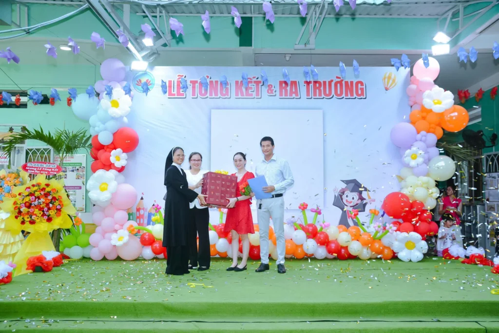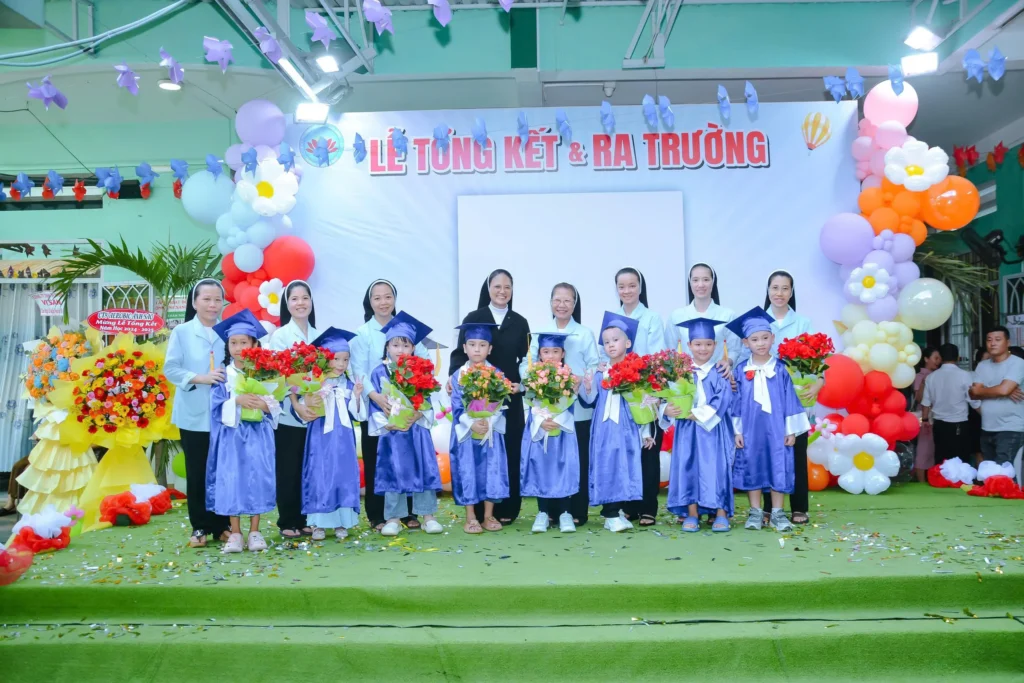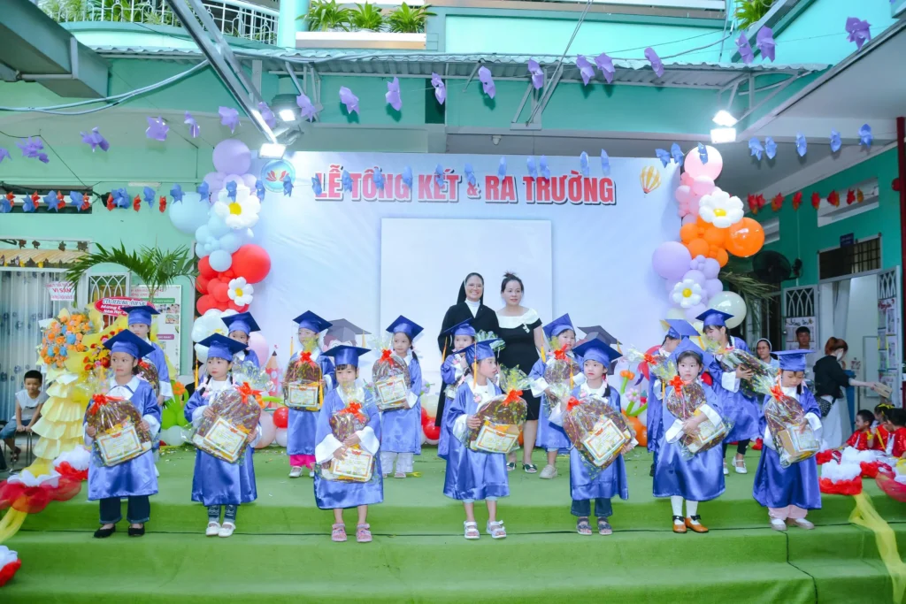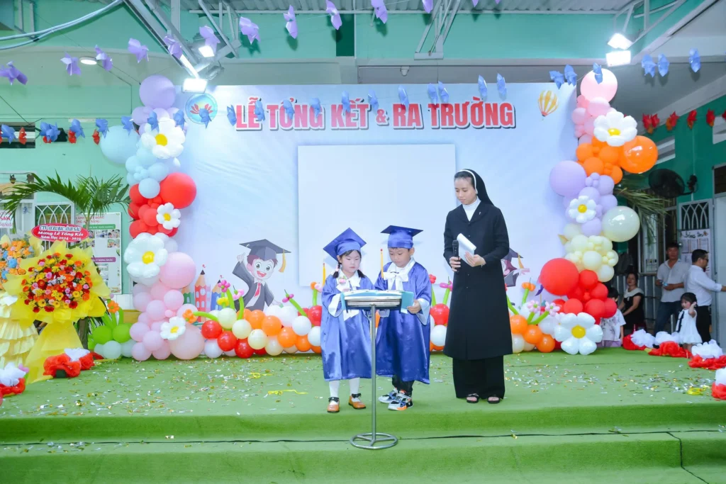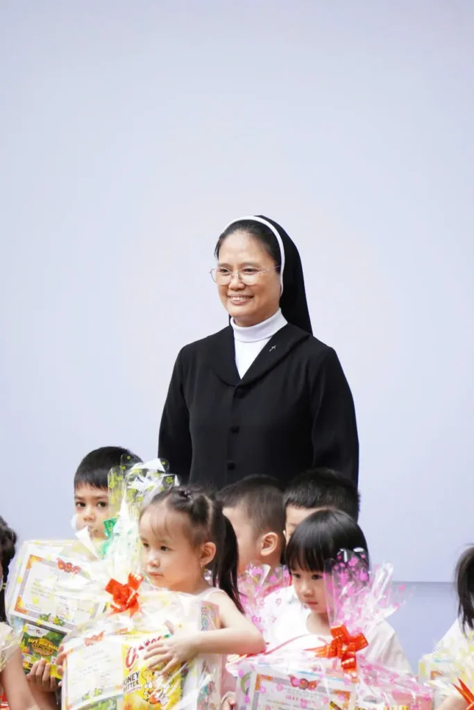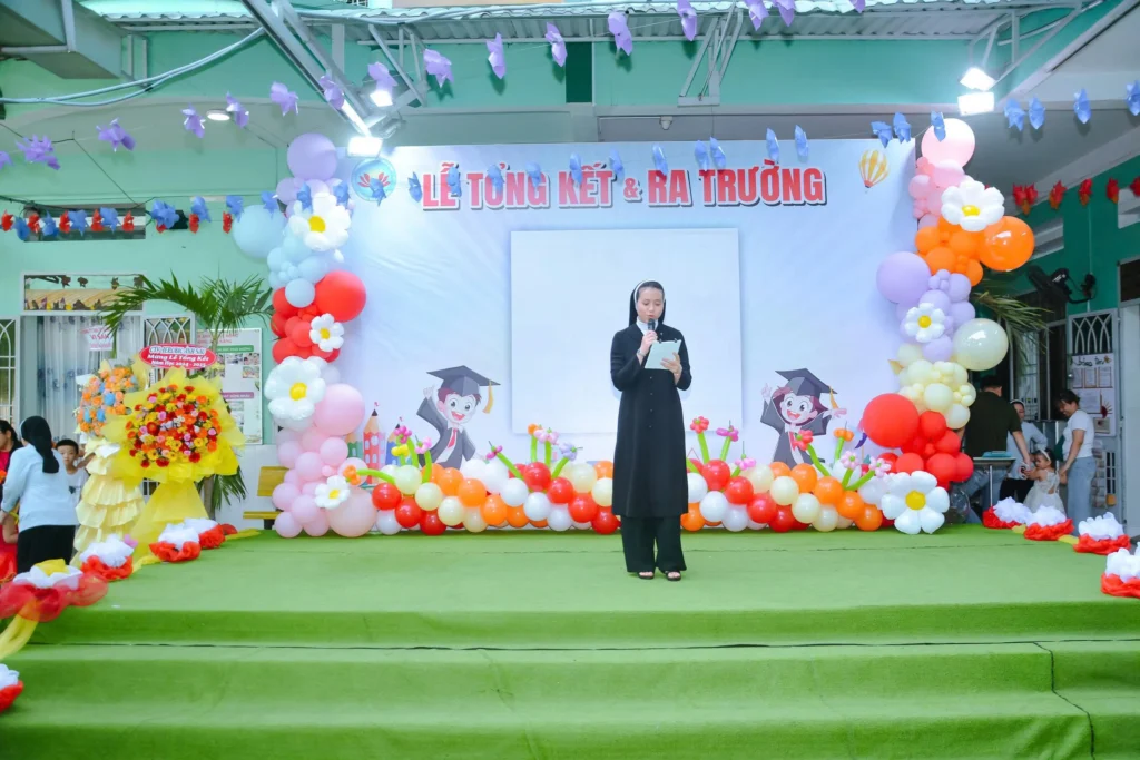 Ngay sau đó, Soeur hiệu trưởng bước lên sân khấu gửi lời phát biểu chúc mừng các bé lớp Lá trong ngày tốt nghiệp đầu đời. Với giọng nói nhẹ nhàng và đầy yêu thương, cô đã chúc các con luôn mạnh khỏe, tự tin và vững bước khi bước vào lớp Một – một chặng đường học tập mới mẻ đang chờ đón.