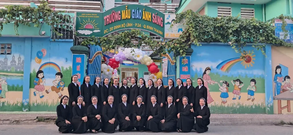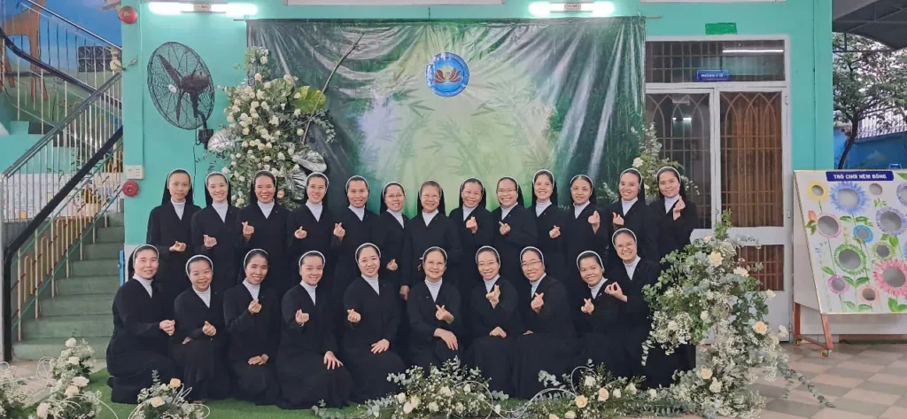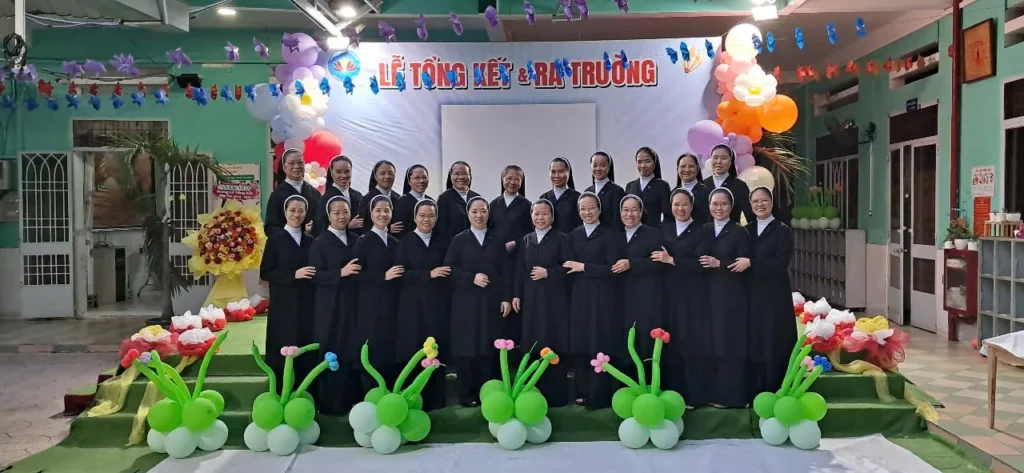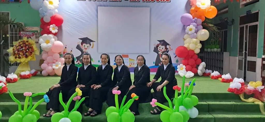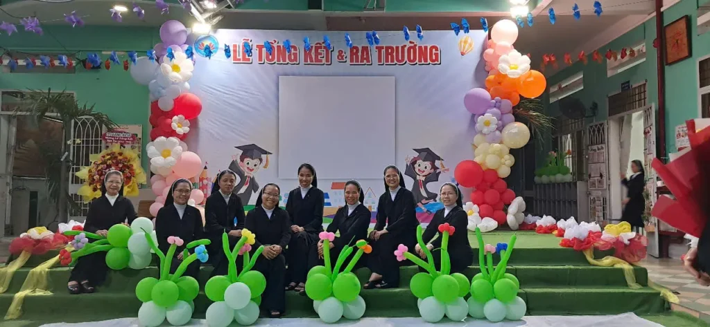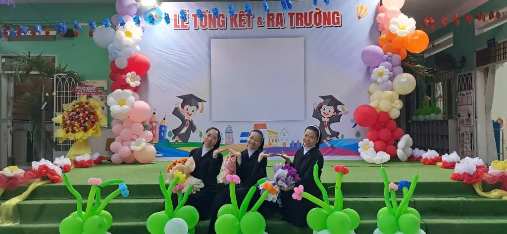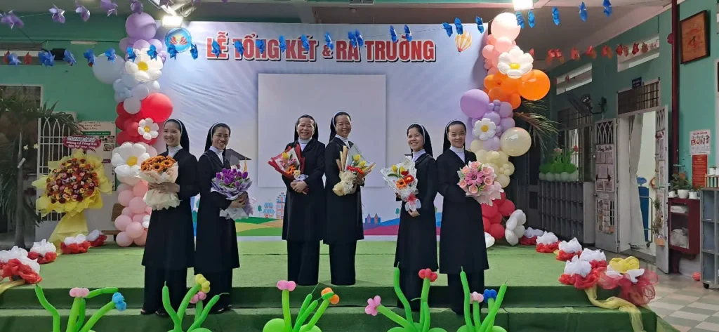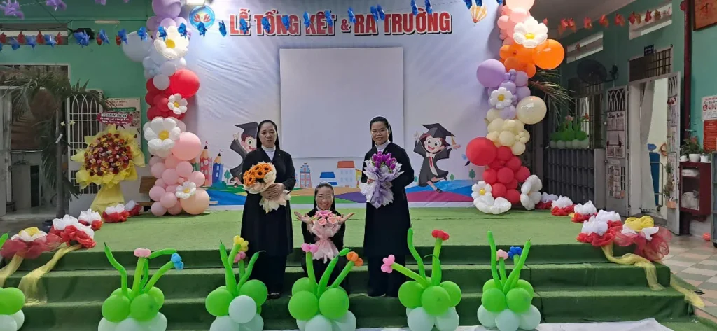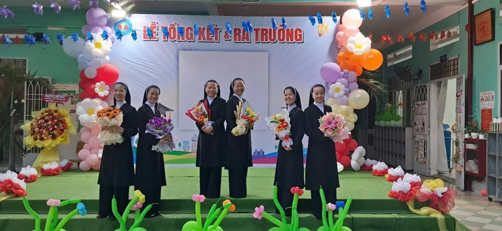Ngay sau đó, Soeur hiệu trưởng bước lên sân khấu gửi lời phát biểu chúc mừng các bé lớp Lá trong ngày tốt nghiệp đầu đời. Với giọng nói nhẹ nhàng và đầy yêu thương, cô đã chúc các con luôn mạnh khỏe, tự tin và vững bước khi bước vào lớp Một – một chặng đường học tập mới mẻ đang chờ đón.