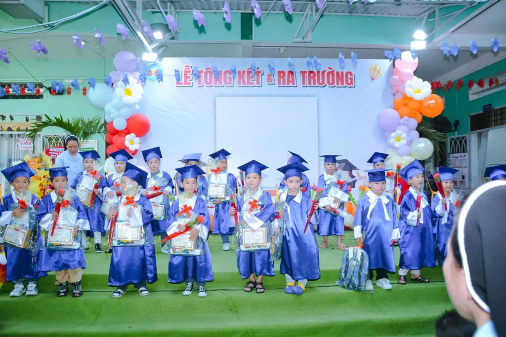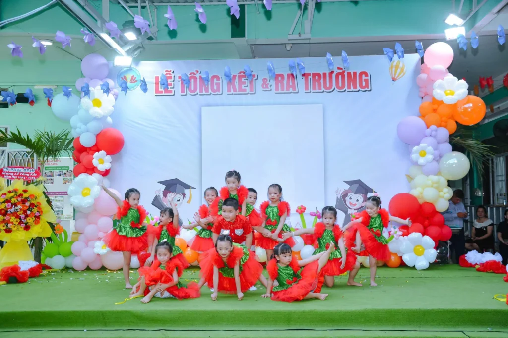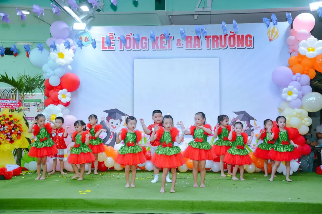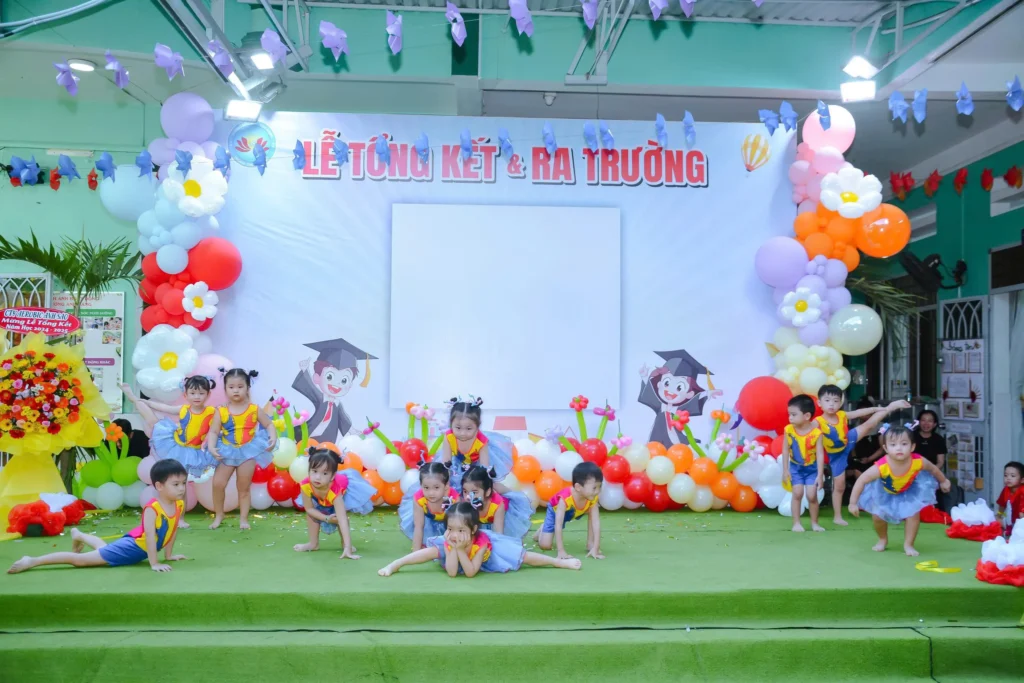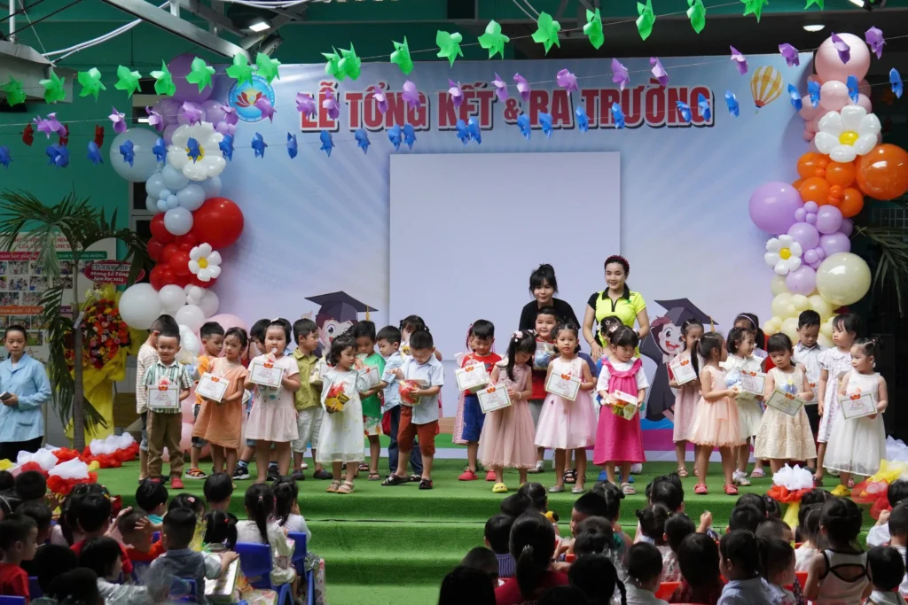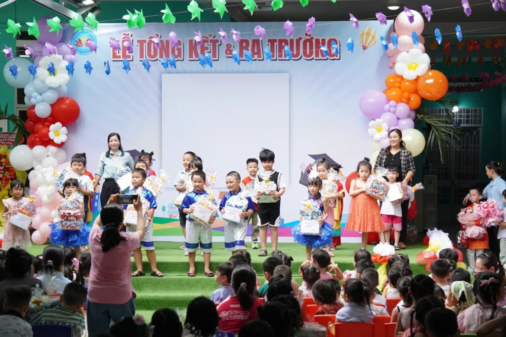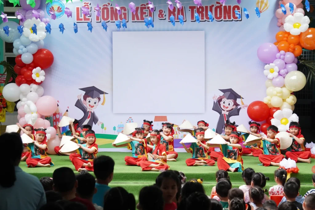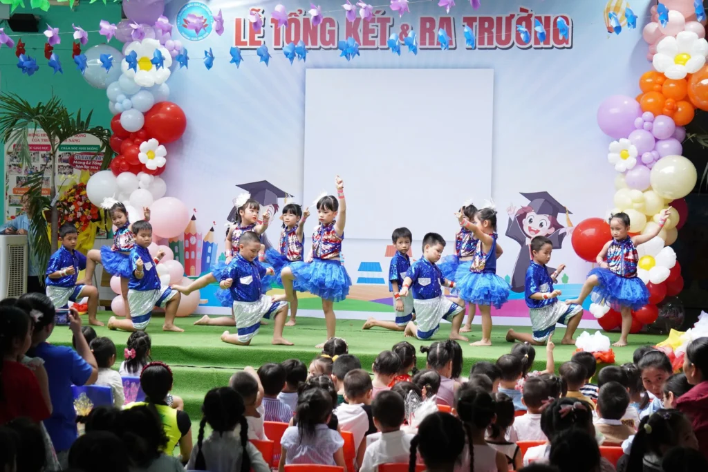 Trong không khí phấn khởi, các anh chị lớp Lá với gương mặt rạng rỡ lần lượt bước lên sân khấu để nhận giấy khen và phần thưởng. Mỗi ánh mắt, mỗi nụ cười đều thể hiện niềm tự hào và hạnh phúc của các con trong ngày đặc biệt này. Các em lớp Mầm và Chồi cũng có tiết mục múa sôi động dành tặng các anh chị như một món quà chia tay, tạo nên sự gắn kết yêu thương giữa các thế hệ học sinh trong trường.