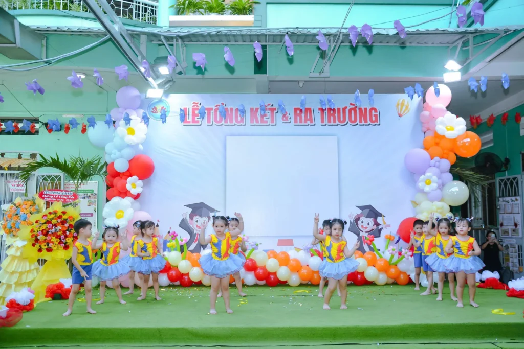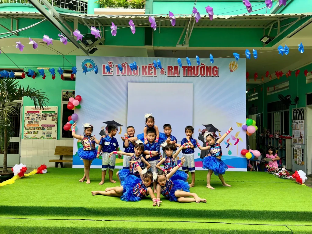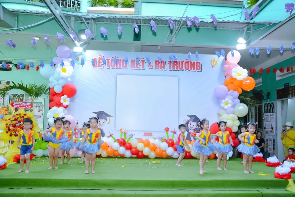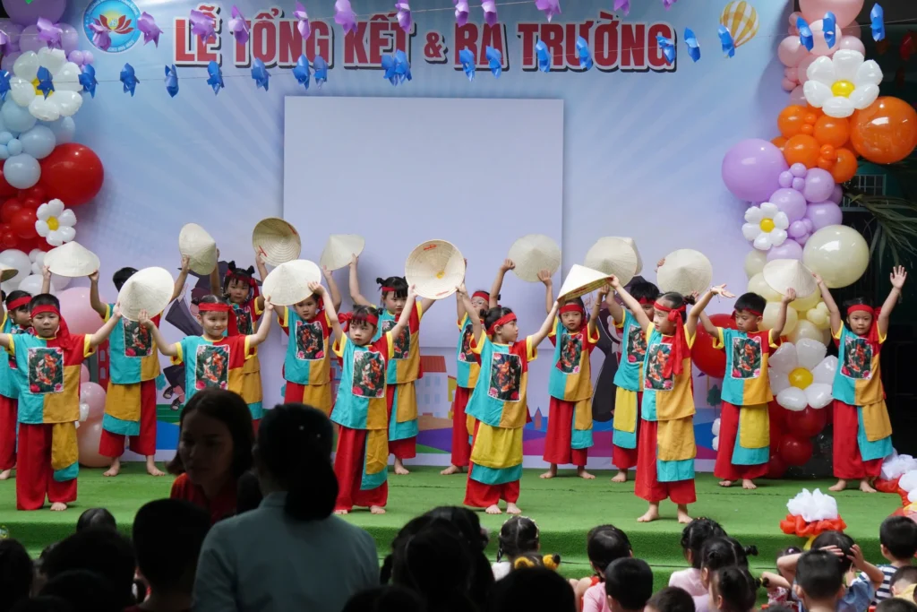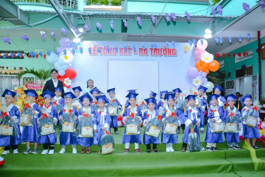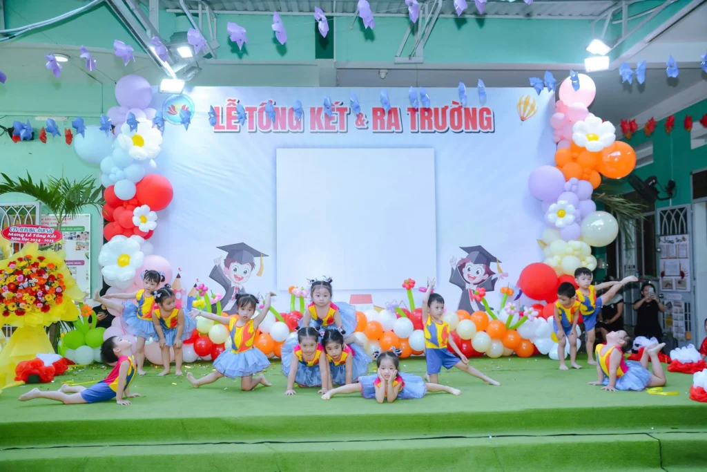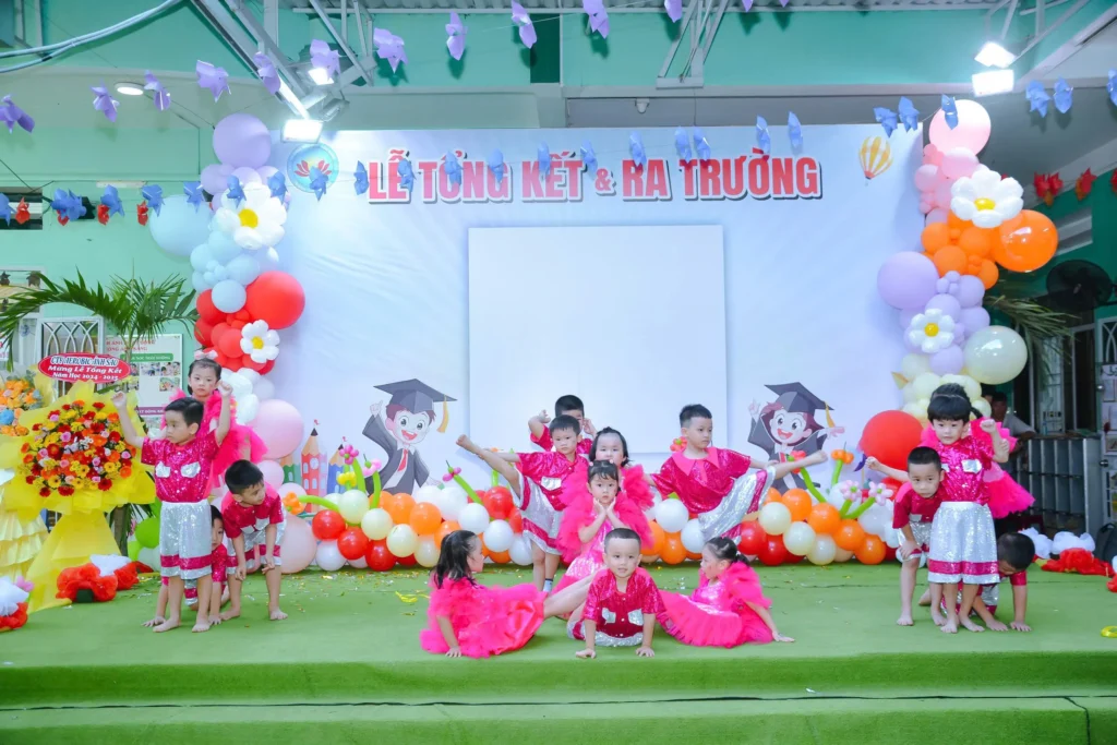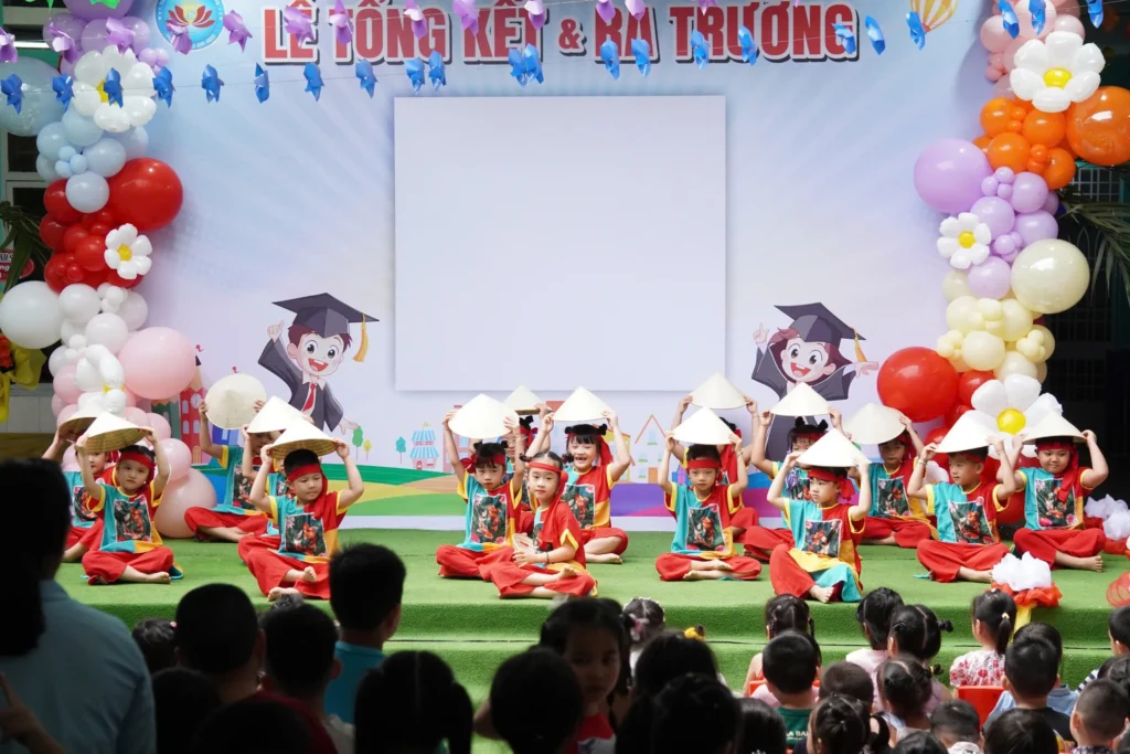 Trong không khí phấn khởi, các anh chị lớp Lá với gương mặt rạng rỡ lần lượt bước lên sân khấu để nhận giấy khen và phần thưởng. Mỗi ánh mắt, mỗi nụ cười đều thể hiện niềm tự hào và hạnh phúc của các con trong ngày đặc biệt này. Các em lớp Mầm và Chồi cũng có tiết mục múa sôi động dành tặng các anh chị như một món quà chia tay, tạo nên sự gắn kết yêu thương giữa các thế hệ học sinh trong trường.