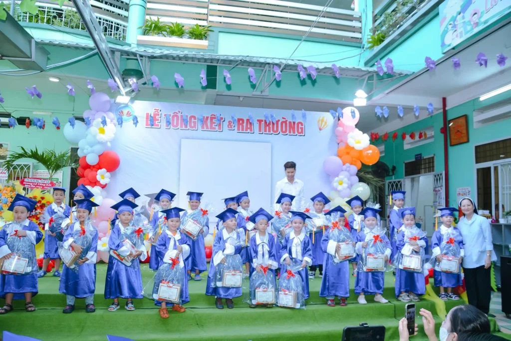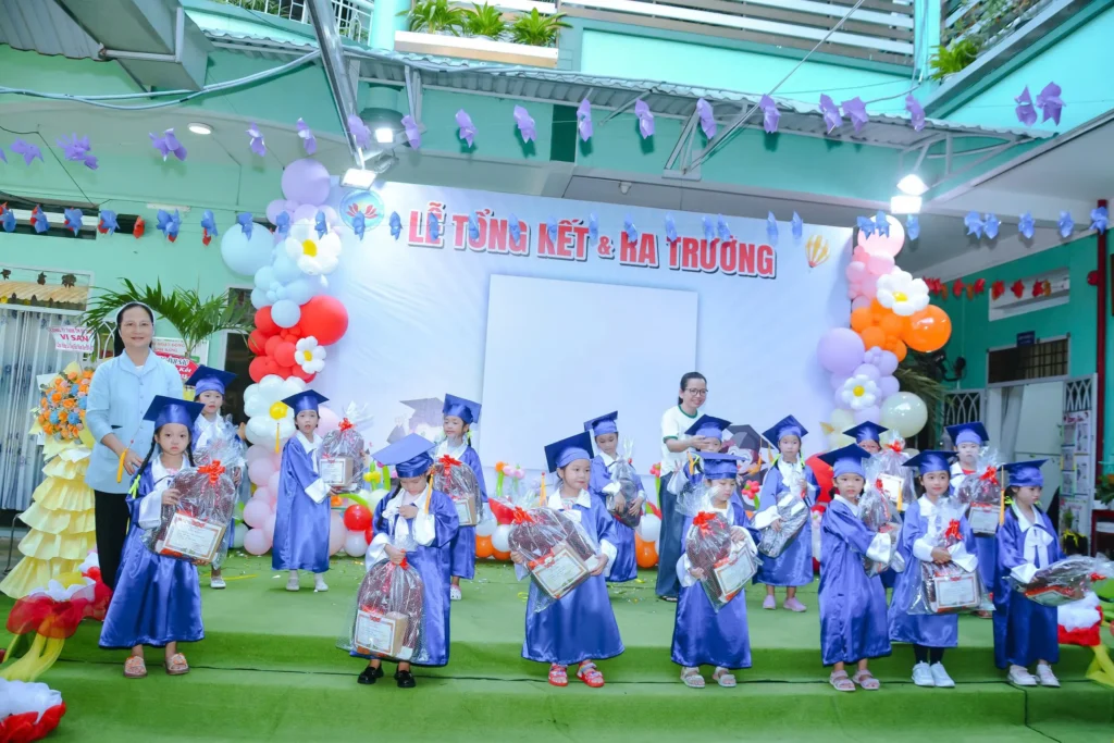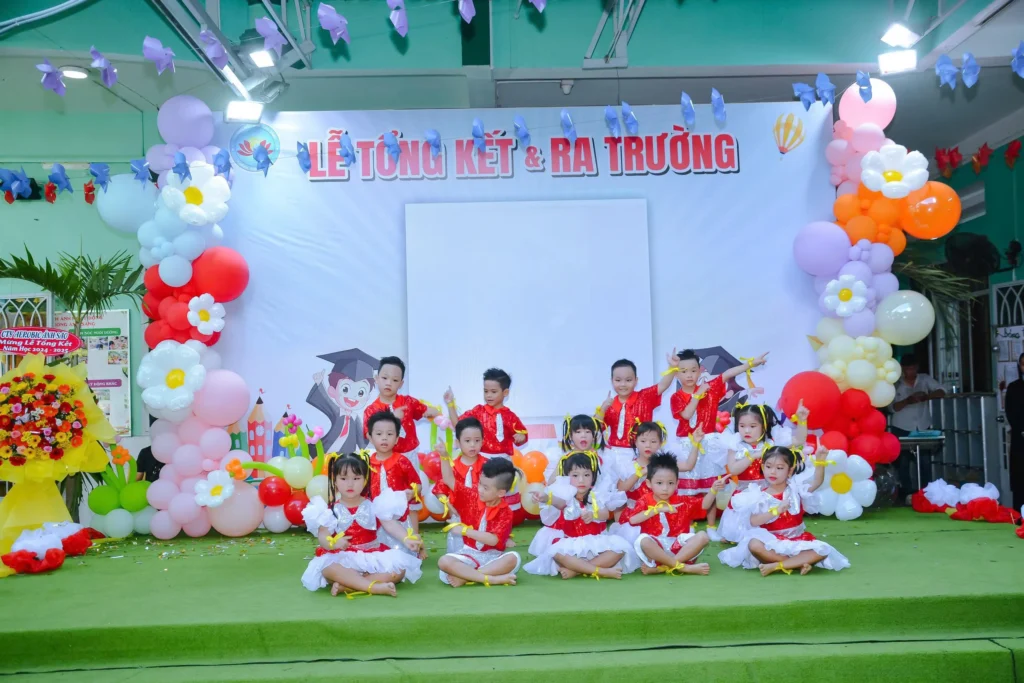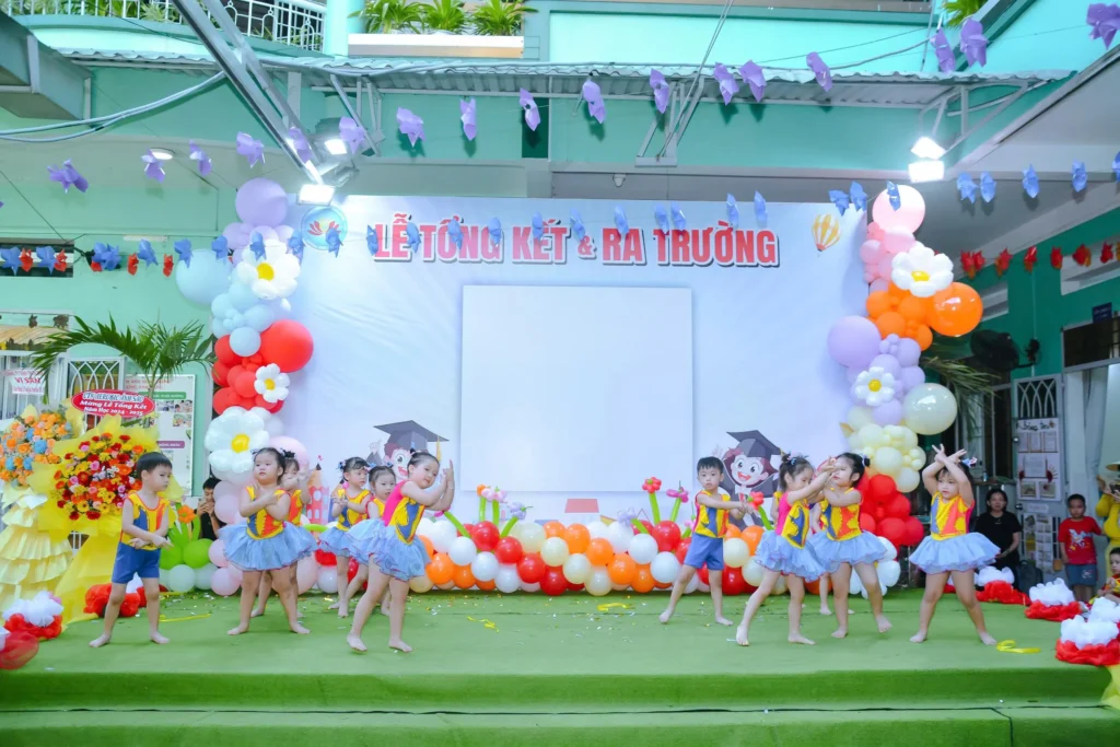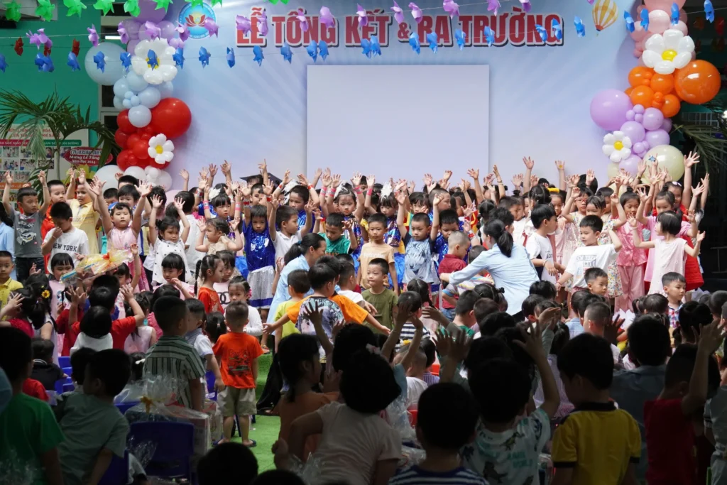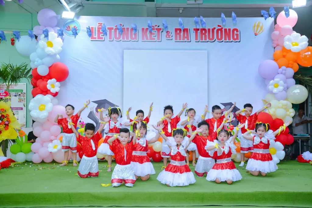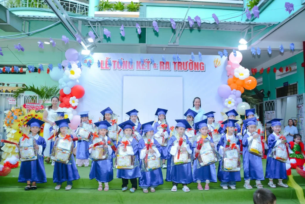 Trong không khí phấn khởi, các anh chị lớp Lá với gương mặt rạng rỡ lần lượt bước lên sân khấu để nhận giấy khen và phần thưởng. Mỗi ánh mắt, mỗi nụ cười đều thể hiện niềm tự hào và hạnh phúc của các con trong ngày đặc biệt này. Các em lớp Mầm và Chồi cũng có tiết mục múa sôi động dành tặng các anh chị như một món quà chia tay, tạo nên sự gắn kết yêu thương giữa các thế hệ học sinh trong trường.