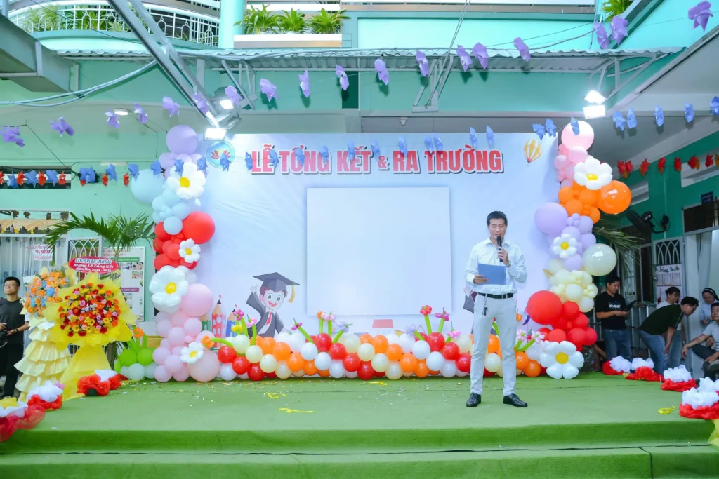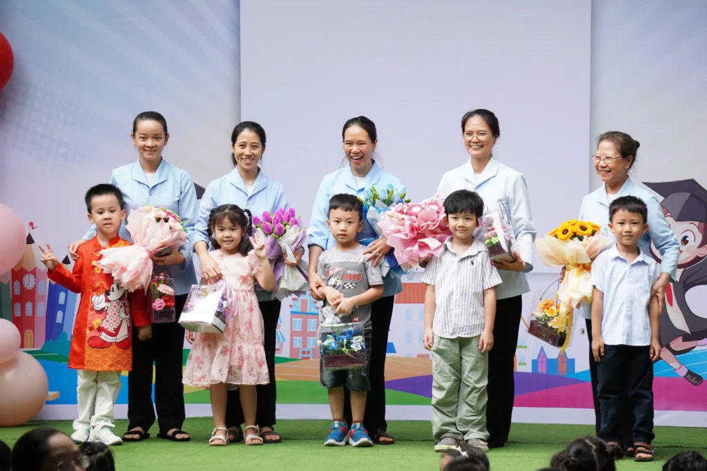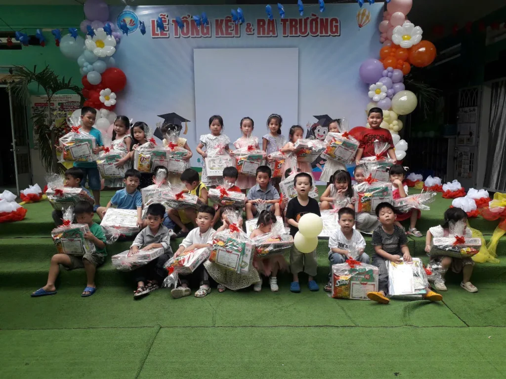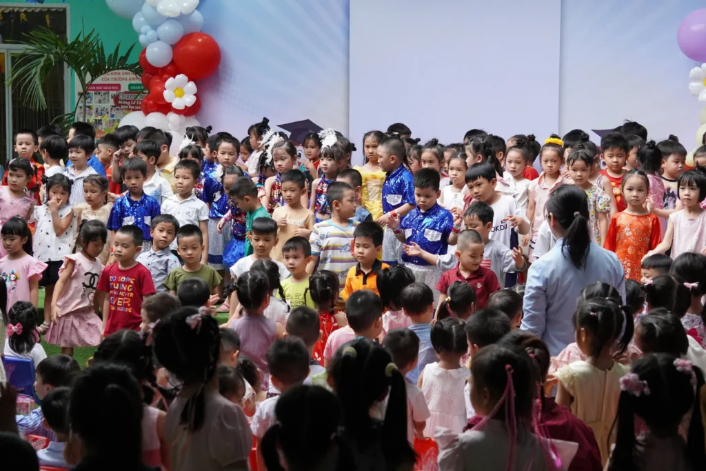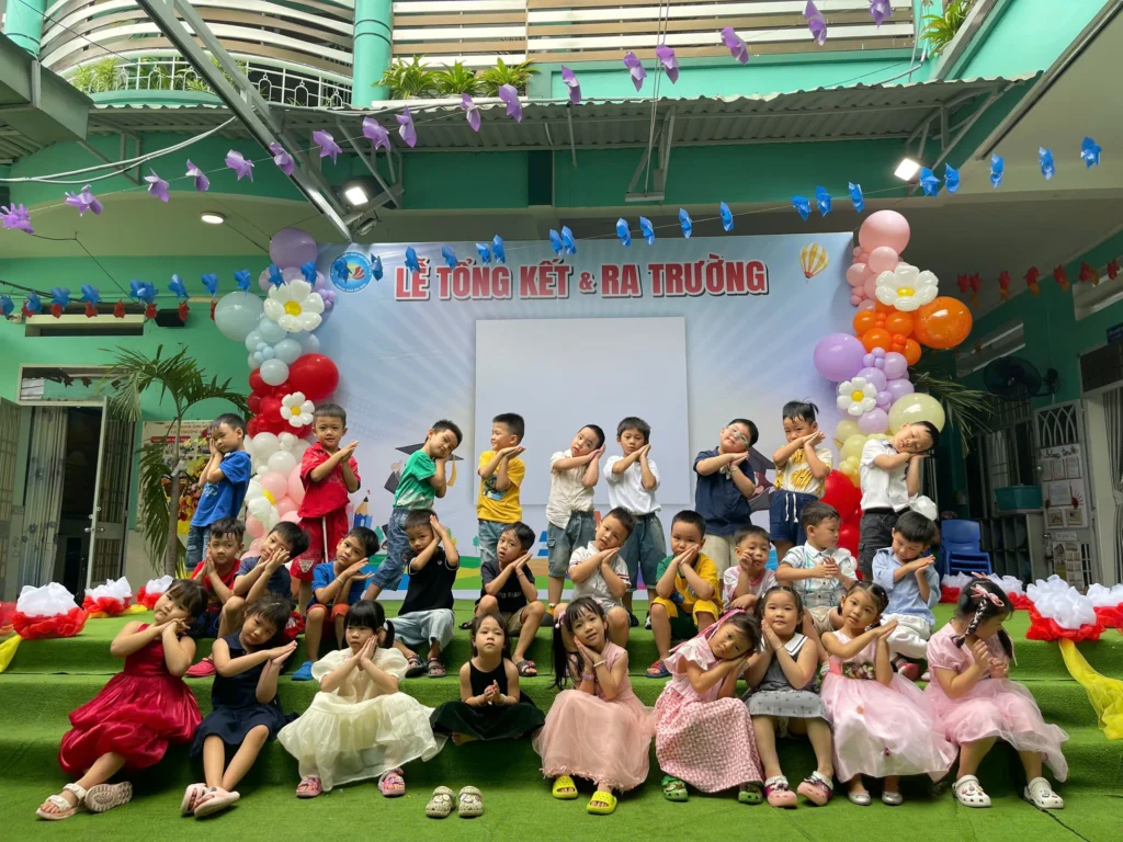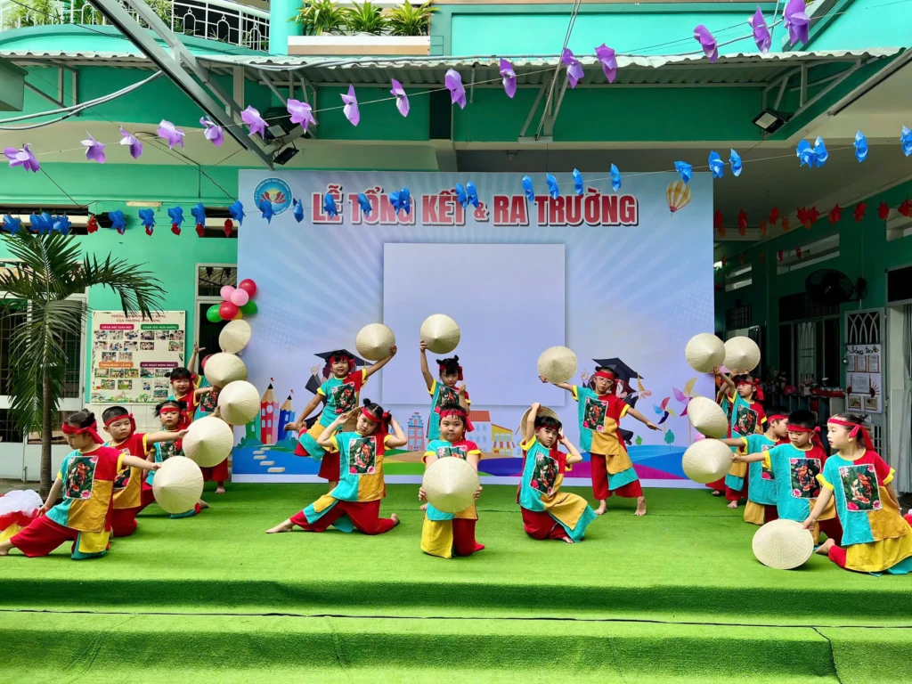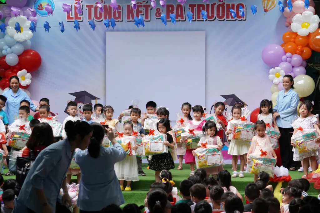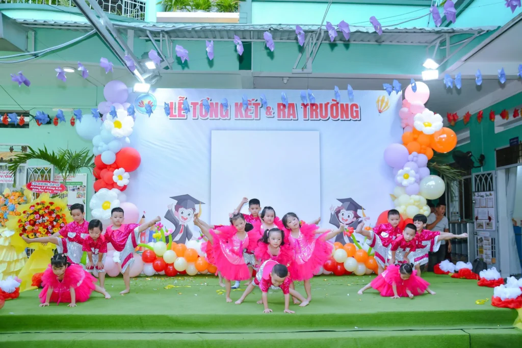 Trong không khí phấn khởi, các anh chị lớp Lá với gương mặt rạng rỡ lần lượt bước lên sân khấu để nhận giấy khen và phần thưởng. Mỗi ánh mắt, mỗi nụ cười đều thể hiện niềm tự hào và hạnh phúc của các con trong ngày đặc biệt này. Các em lớp Mầm và Chồi cũng có tiết mục múa sôi động dành tặng các anh chị như một món quà chia tay, tạo nên sự gắn kết yêu thương giữa các thế hệ học sinh trong trường.