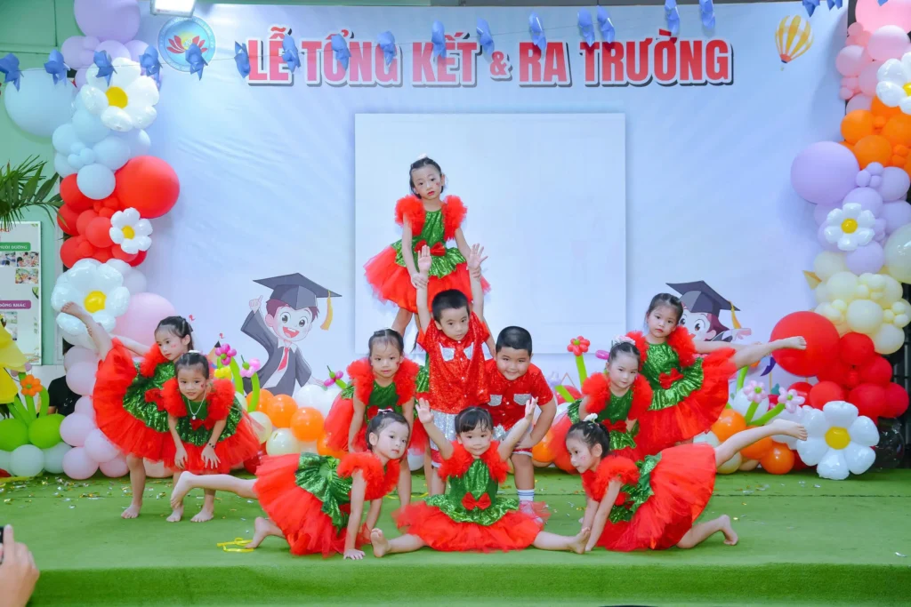 Khép lại buổi lễ, các anh chị lớp Lá đã cùng nhau biểu diễn tiết mục múa “Tạm biệt búp bê thân yêu”. Giai điệu quen thuộc cùng những động tác uyển chuyển, dứt khoát đã khiến cả hội trường xúc động. Nhiều phụ huynh rưng rưng nước mắt khi nhìn thấy con mình trưởng thành hơn từng ngày.