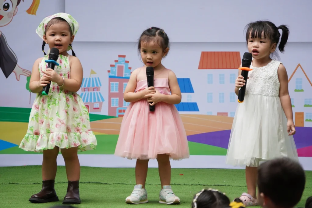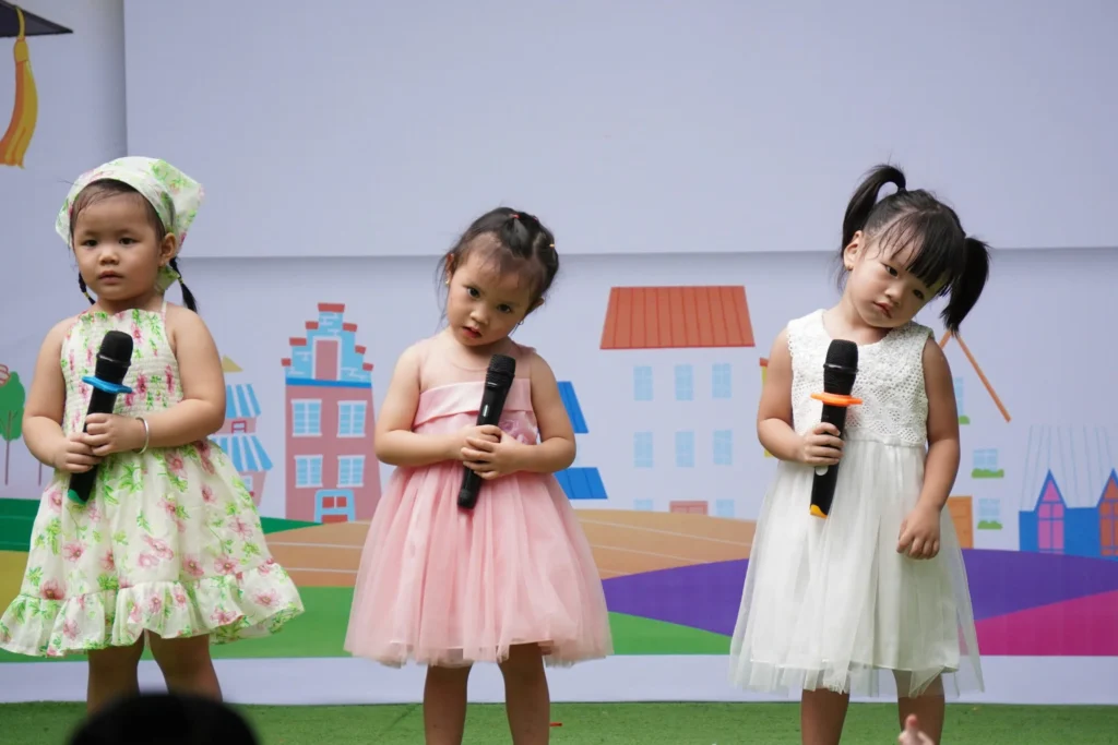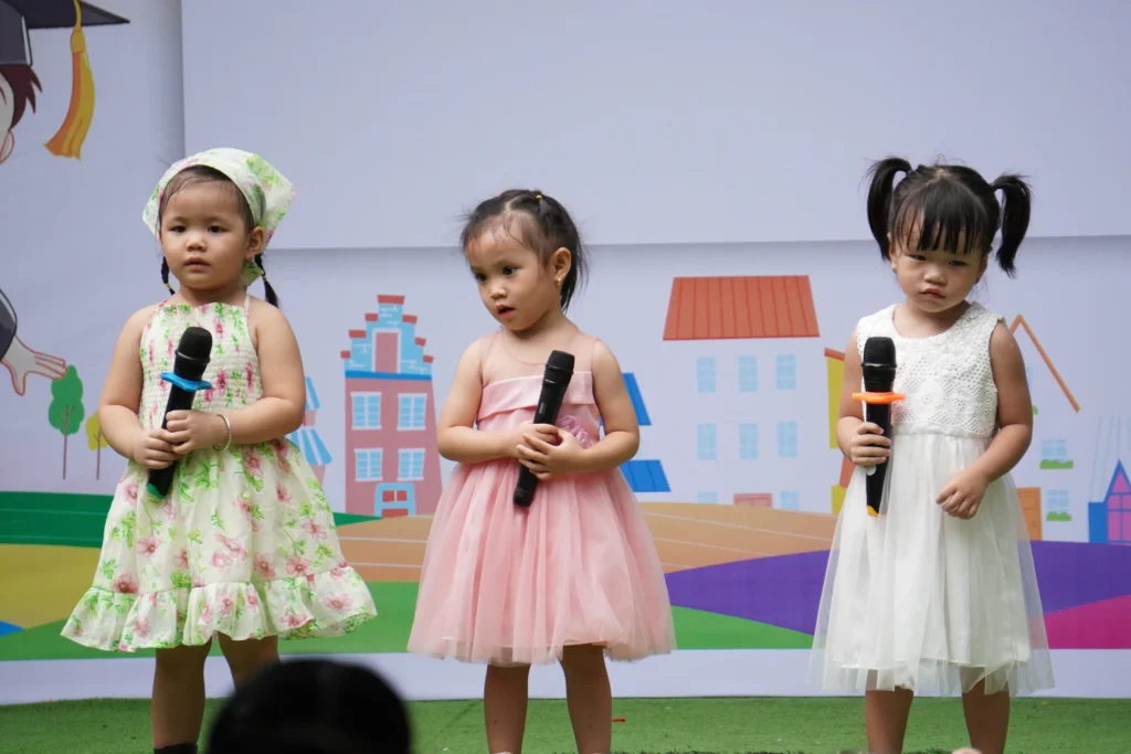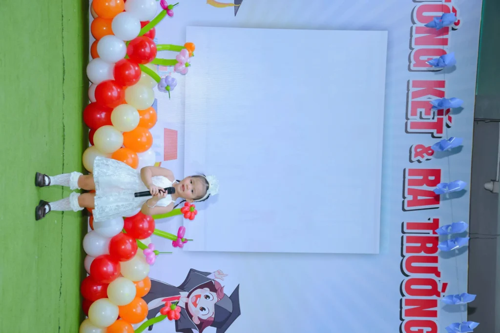 Buổi lễ ra trường của các anh chị lớp Lá diễn ra trong không khí trang trọng, ấm áp và đầy cảm xúc. Mở đầu chương trình là phần biểu diễn của bé Hải My, 2 tuổi, đến từ lớp Nhà Trẻ với ca khúc “Mẹ ơi có biết”. Dù còn nhỏ nhưng Hải My đã thể hiện rất tự tin và hát đúng nhịp, khiến cả hội trường không khỏi bất ngờ và thích thú. Tiết mục nhỏ đã mang đến sự tươi mới, dễ thương, mở màn cho buổi lễ đầy ý nghĩa.